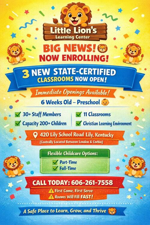 Call TODAY: 606-261-7558 or register online https://littlelionslearningcenter.us