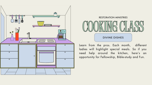 Learn from the pros! Each month we will have different ladies that will highlight a special meal. So if you need help around the kitchen, here's an opportunity for fellowship, bible-study and fun.